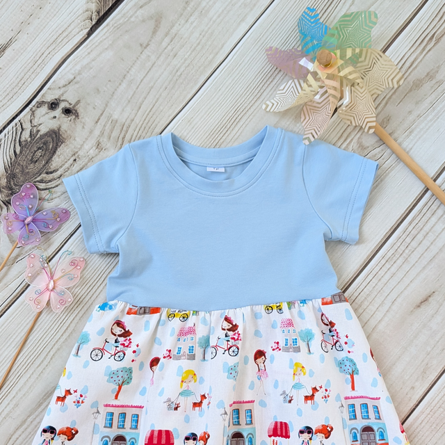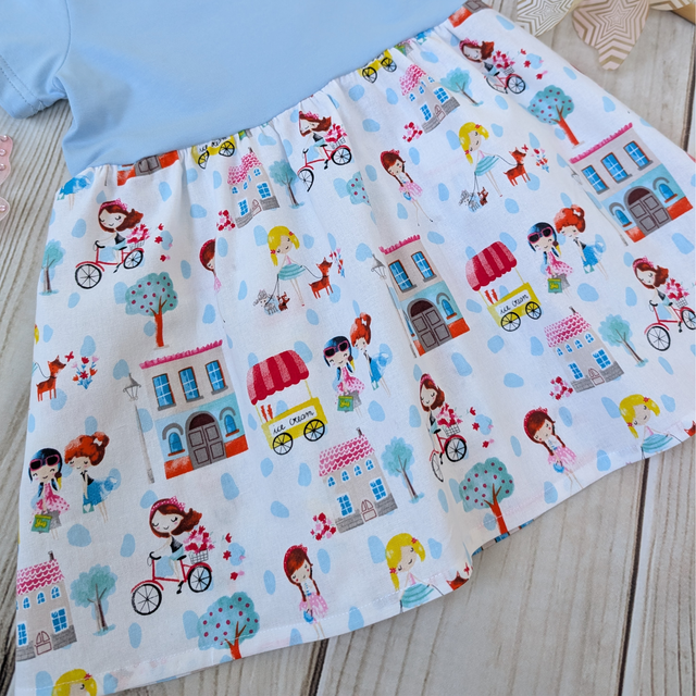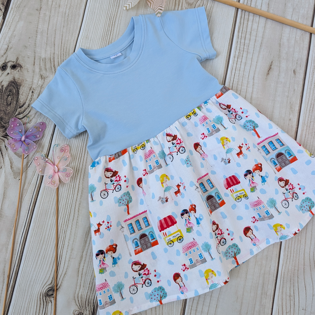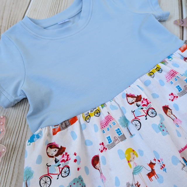 Let adventures begin with this charming Girls Day Out dress from Sewn by Sadie Bee! This one-of-a-kind handmade dress features a vibrant print of girls on bikes, ice cream carts, and neighbourhood fun – perfect for little ones who love to twirl!
