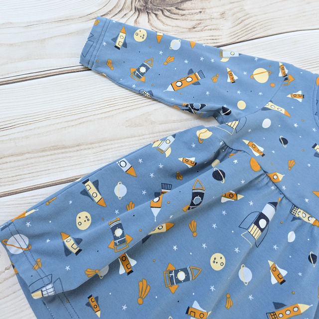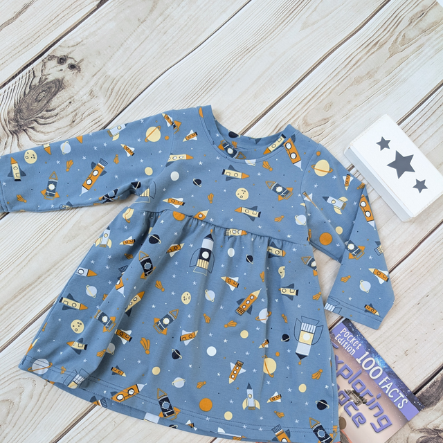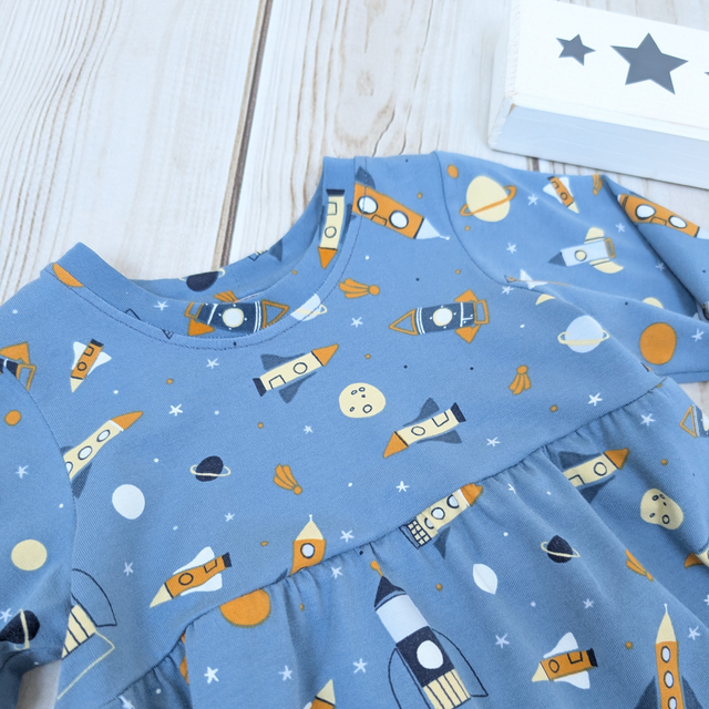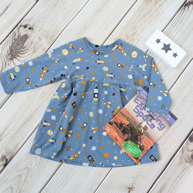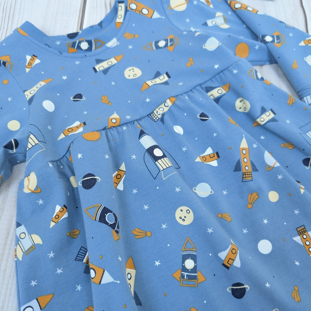 Launch into adventure with my stellar Space Rocket Dress! Perfect for aspiring astronauts, this captivating dress features an exciting blue galaxy print of rockets. It's designed for comfort and cosmic exploration, an instant favourite for everyday wear or special occasions.