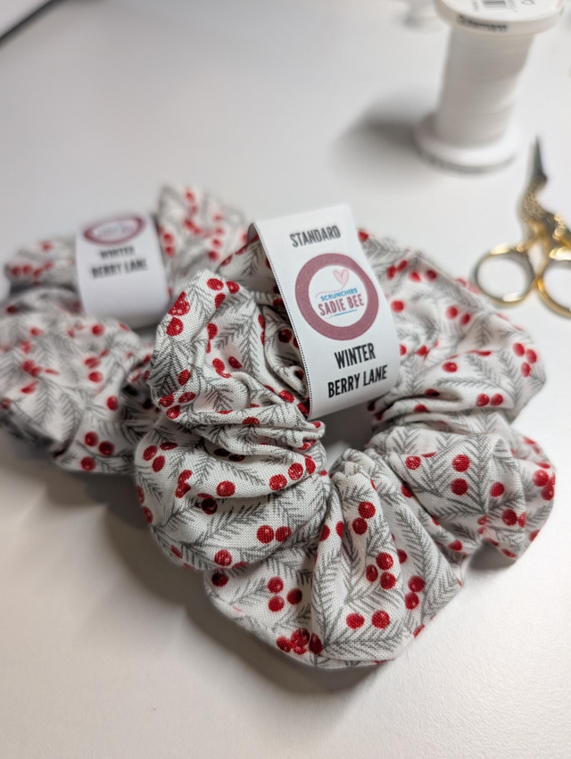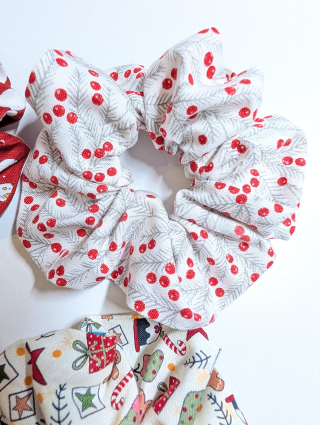 Cute berries and pine design scrunchie, handmade with 100% cotton.