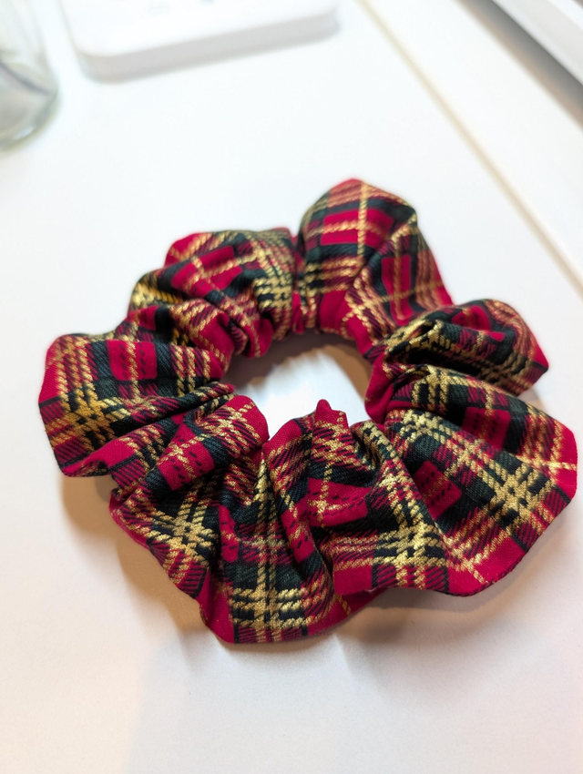 Tartan with gold design scrunchie, handmade with 100% cotton.